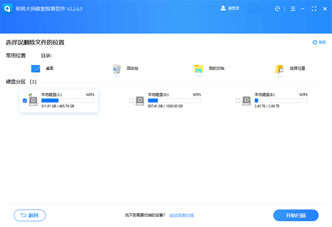 运行转转大师数据恢复软件,选择文件丢失位置,开始进行扫描